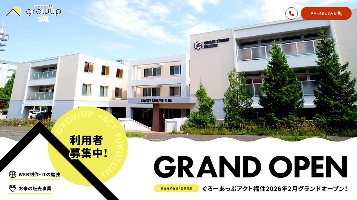 ぐろーあっぷアクト福住の施設サイト制作では、グランドオープンの認知拡大と利用希望者の獲得を目的に、施設の魅力と支援内容を整理して発信できるWeb設計を行いました。
