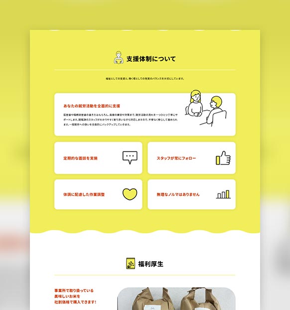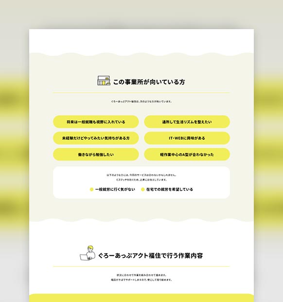 「働きながら学び、将来の一般就職につなげていく」という施設の方針が伝わり、利用を検討する方が前向きな一歩を踏み出せるように。アイコンやイラストを活用しながらも、信頼感のあるトーンを崩さず、見やすさと安心感を両立したサイトとして仕上げています。